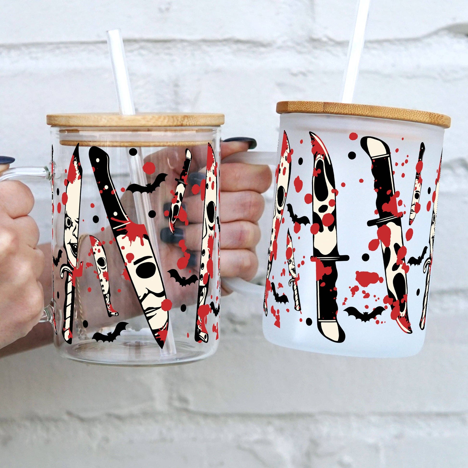 Check out our super spooky Spooky Splatter glass can cup – the perfect gift for those who love a frightfully fun season! It’s decorated with creepy knives featuring blood splatter, and inside the blades are your favorite Halloween characters, bringing a chilling touch to every sip.